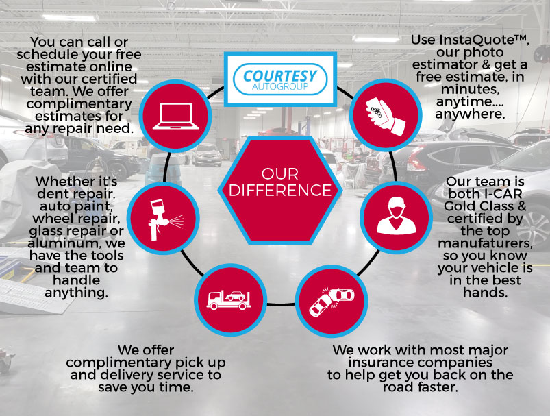 Courtesy Collision Centers in Tampa, FL offer a unique way to get a complimentary estimate anytime…from anywhere, without having to visit our collision. The process only requires you to take 7 pictures and takes a little less than 5 minutes. Once complete, we will put you in touch with our certified estimators to get your process started.